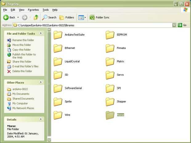 Para instalar la biblioteca en primer lugar, cree un directorio para Morse dentro de las bibliotecas de sub-directorio del directorio sketchbook. Copie o mueva los archivos Morse.h y Morse.cpp en ese directorio. Ahora lanzan el entorno de Arduino. Si abres el dibujo > menú de biblioteca de importación, se debe ver Morse dentro. La biblioteca se compilarán con bocetos que lo utilizan. Si la biblioteca no parece construir, asegúrese de que los archivos realmente terminan en .cpp y .h (con no extra .pde o .txt extensión, por ejemplo).