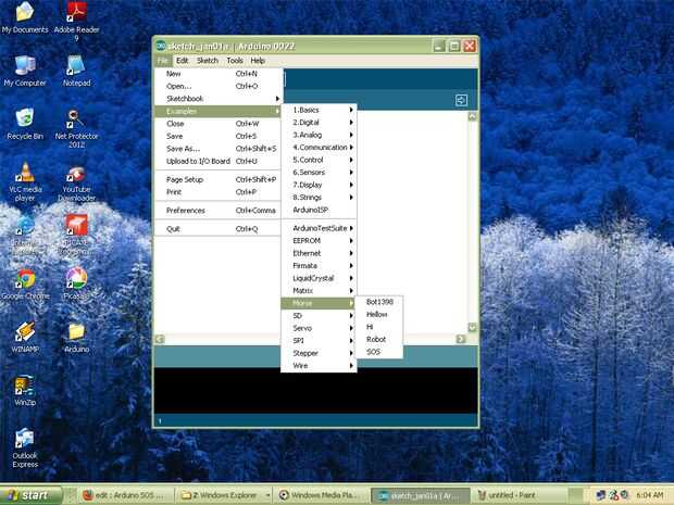 Los códigos de ejemplo están incluidos en el biblioteca sólo abrir el archivo > ejemplos > Morse y elija su mensaje deseado que se quiere mostrar (ver la última captura de pantalla). Si desea mostrar cualquier otro mensaje que no sea en la biblioteca no dude de preguntar o hacerlo mismo.
