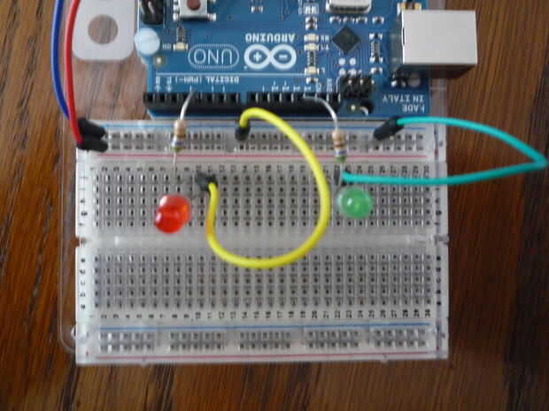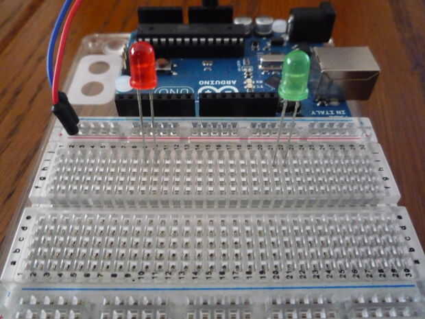 Finalmente, tome un cable de puente y la otra pata del LED al carril bus de tierra y hacer lo mismo con el LED verde.