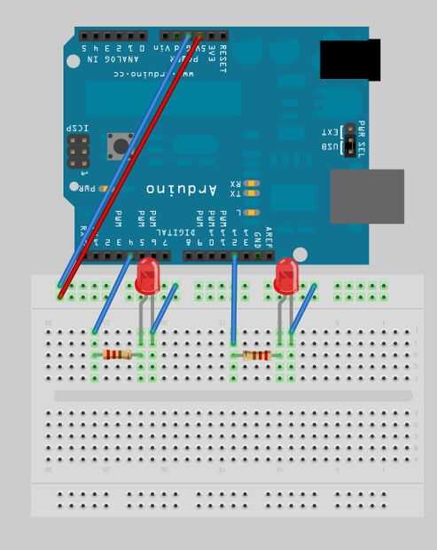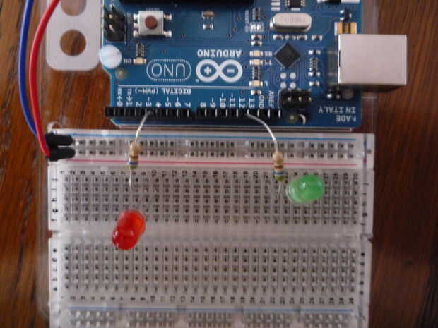 A continuación, conecte una resistencia de 560 ohm en el ferrocarril conectado a la pata más larga (+ ve) de cada LED y tomar la resistencia del LED rojo al pin digital de Arduino 4. Luego tomar el otro extremo del resistor del LED verde al pin 12 en el Arduino.