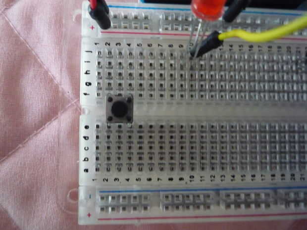 Enchufe un botón sobre el boquete en medio de la protoboard - asegurarse de que esto es la forma correcta de ronda. Que tendrás que doblar los pines.