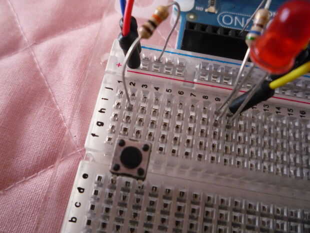 A continuación, conecte una resistencia de ohm k 10 de una pierna del botón para el carril bus de tierra y use un cable puente para conectar la otra pata del mismo lado de la brecha en el riel de 5V.