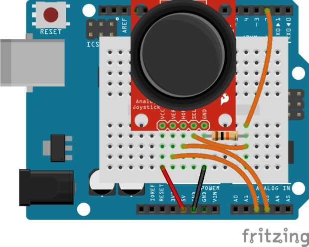 4. Joystick de pulgar - pin 1 va a 5v, pines 2 & 3 ir a un pin analógico, pin 4 va a tierra a través de un resistor de 10kΩ (marrón-negro-naranja) y un pin digital y pin 5 va al suelo.