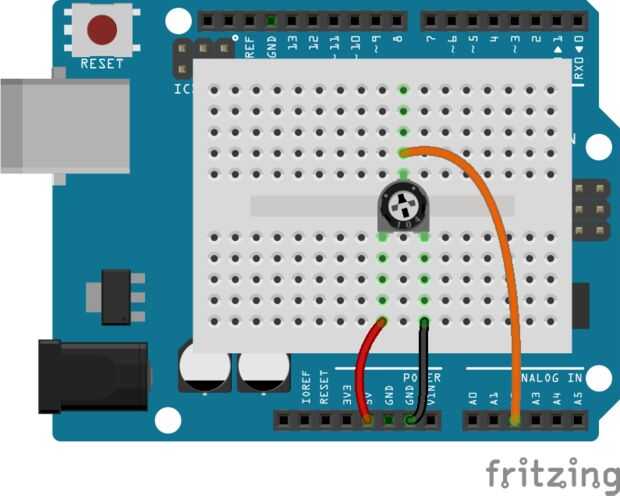 3. Potenciómetro - conectar a 5v, tierra, y el pin del medio va a un pin analógico.
