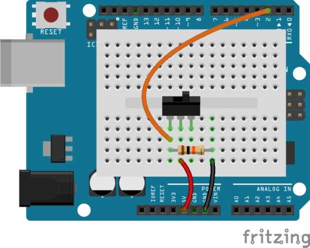 2. Interruptor de palanca - conectar a 5v y tierra a través de un resistor de 10kΩ (marrón-negro-naranja). En el lado de tierra, conecte a un pin digital.