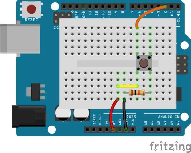 1. Pulsador - conectar a 5v y tierra a través de un resistor de 10kΩ (marrón-negro-naranja). En el lado de tierra, conecte a un pin digital.