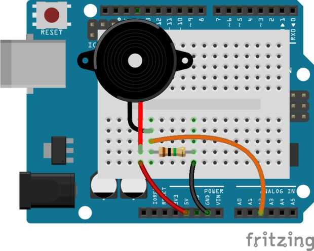 4. Piezoeléctrico (como entrada) - conectar a 5v, tierra a través de un resistor de 1MΩ (marrón-negro-verde), y el lado puesto a tierra también va a un pin analógico