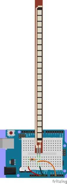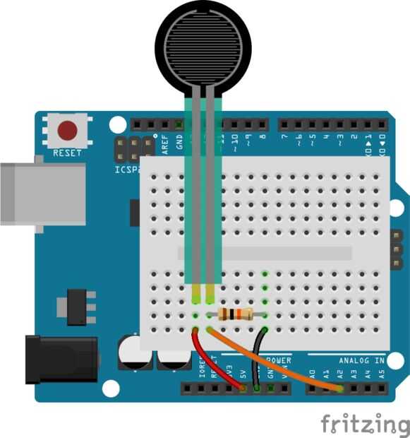6. Sensing Resistor - va a 5v, la fuerza y la tierra a través de un resistor de 10kΩ (marrón-negro-naranja). El lado puesto a tierra también va a un pin analógico.