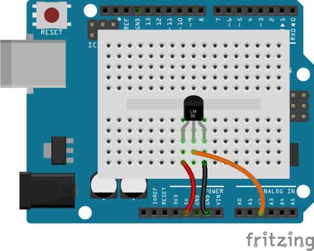 1. Sensor de temperatura - conectar a 5v, tierra, y medio va a un pin analógico