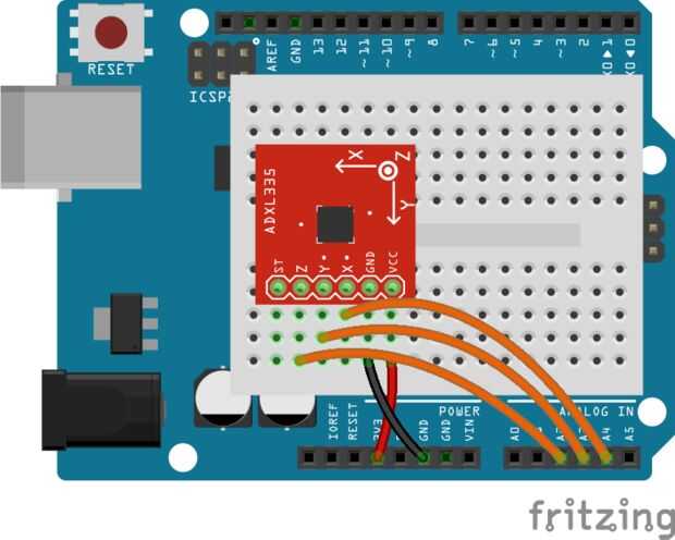5. Acelerómetro de tres ejes - el pin 1 es desconectado, pines 2-4 ir a un pin analógico, pin 5 va a tierra y pin 6 va a 5v