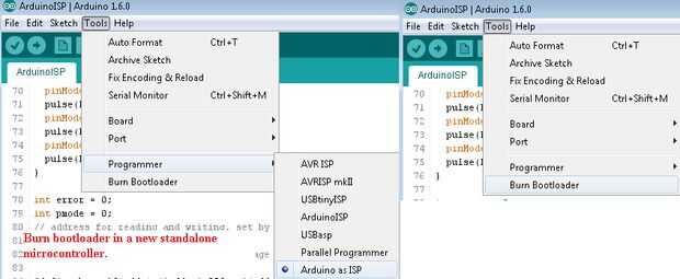 actualización: este tutorial funciona en el IDE de Arduino 1.0.1, la reciente 1.0.5 hace algunos cambios en el bosquejo de ISP así que no estoy seguro si funcionará (solo compré 2 ATMega328 y quemados tanto en 1.0.1).Por favor utilice 1.0.1 para elim