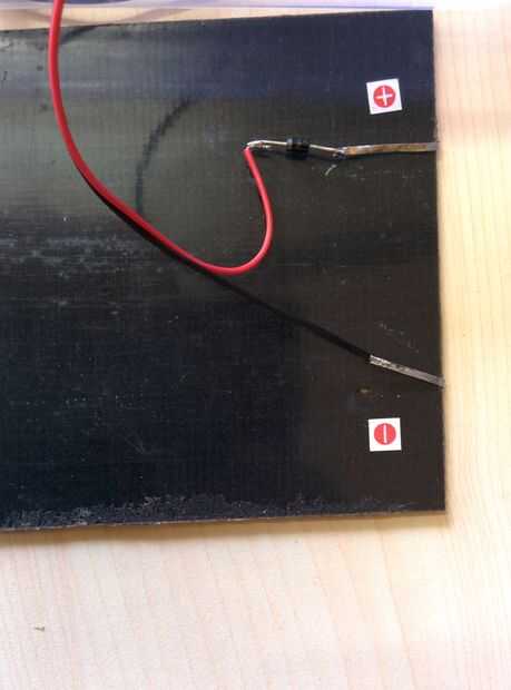 Soldar el terminal positivo del panel solar al terminal positivo del diodo y el terminal negativo del diodo al cable rojo del cargador.