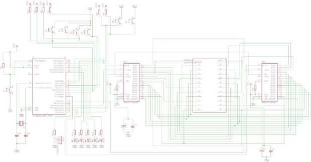 El circuito está diseñado con Eagle Layout Editor y se adjunta archivo PDF. Interruptor táctil cuatro S2-S5 se utiliza para control para arriba, abajo, izquierda y derecha del control. Interruptor S6 y S7 se utiliza para la opción menú y juego de selector. S1 se utiliza como interruptor de reset del microcontrolador. Resistencias R4 - R9 se utiliza como Levante puede ser cualquier valor de resistencia 10K - 100K. Cinco LED LED1-LED5 se utiliza para indicar el nivel de un juego y el valor de serie resistencias conectadas a los LEDs debe ser 220 Ohmios - 330 ohm. Como que utiliza pantalla de matriz de punto bicolor para usé dos MAX7219CNG controlador IC. Puede utilizar la matriz RGB y ese tiempo tres driver IC será necesario. Dos resistencias R1 y R2 está conectado a las ICs para controlar el brillo de la pantalla de la matriz.