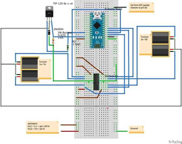 El circuito básico de Arduino para manejar 2 desvíos se muestra en el diagrama de Fritzing anterior.