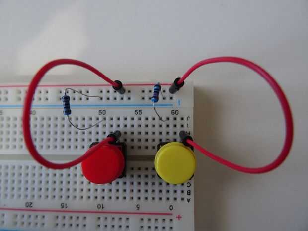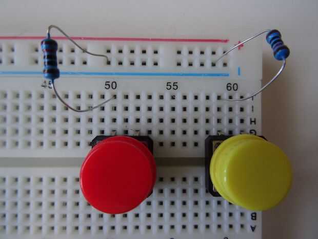 2. Conectar las resistencias entre extremos uno de los botones y la tierra en el autobús de la poder de protoboard (foto 2)