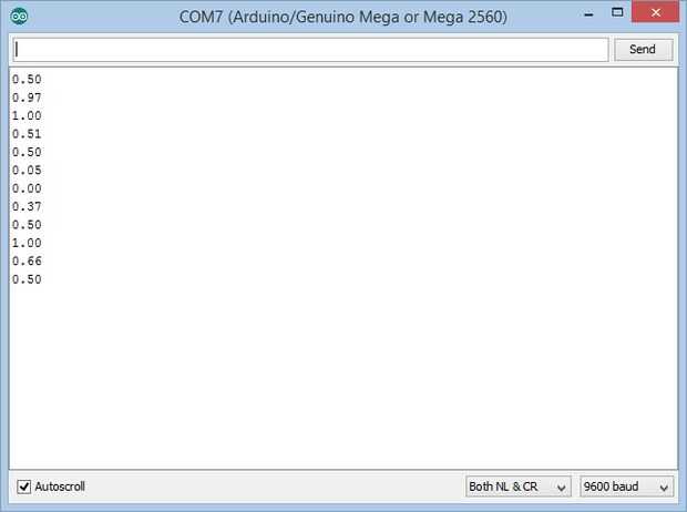4. La posición de la palanca se imprimirá en la serie, cada vez que ha cambiado. La posición será en valores entre 0 y 1 donde 0,5 es la posición del centro del palo