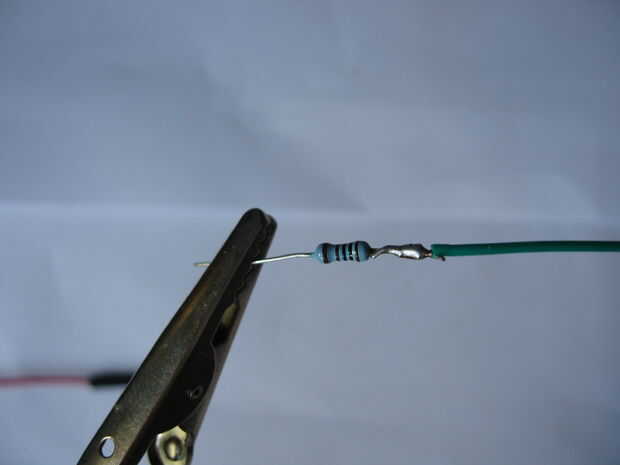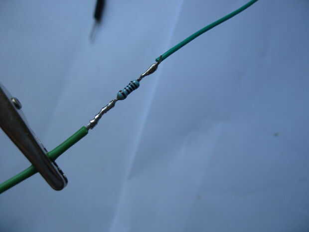 Vamos a añadir una resistencia de 1K al cable de control sólo porque podemos y evita cualquier riesgo de excesiva corriente que fluye cuando nos tire bajo con el microcontrolador. Por lo tanto, suelde la resistencia a la cabeza de puente verde y luego con el alambre verde del extensor ATX. Suelde los cables morados y negros con los puentes correspondientes (en mi caso rojo y negro). Finalmente, calentar al termo-retráctil.