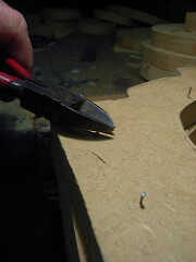 Para mantener las mitades alineadas mientras que talla, clavijas fueron fijados en la mitad delantera. Esto se hizo por clavar los pernos en el tablero y cortar con tijeras las cabezas.