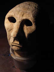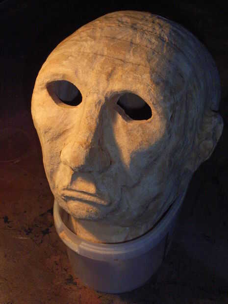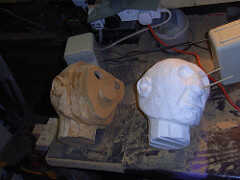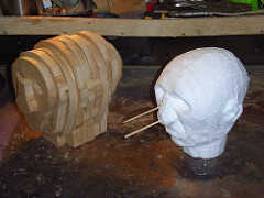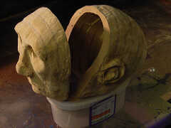 Conforme avanza la talla, la copia se comprobó con el modelo. Abajo a la izquierda, la copia puede verse a medio camino a través. El tiro medio muestra la cabeza tallada (antes lijado final, que tuvo casi tanto como la talla). La foto de la derecha muestra las dos mitades separadas mostrando la cavidad interna necesaria para el globo ocular mechnism de la casa.