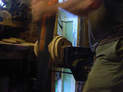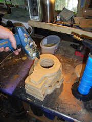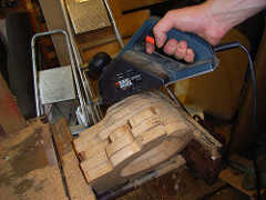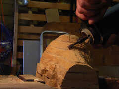 Superficies convexas se corta con una sierra de mano y alisadas aproximadamente hacia abajo usando un cepillo de la energía. El detalle fino fue tallado usando un poco de talla cilíndrica de carburo de tungsteno sólido terminado en cúpula en un enrutador portátil.