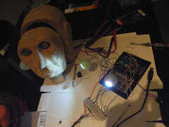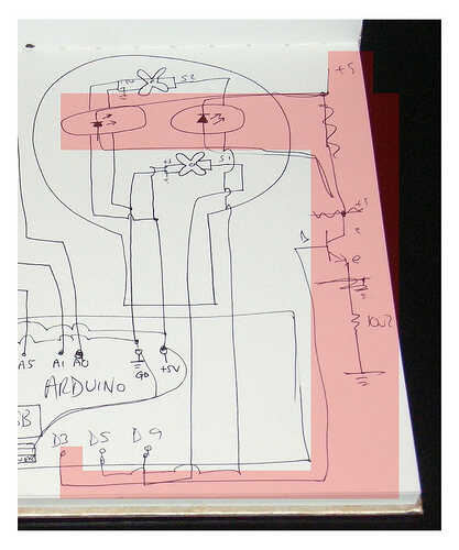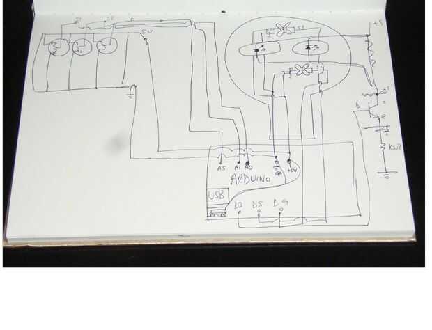 El circuito electrónico para esto es realmente absurdamente simple. Las entradas eran simples resistencias variables de viejos equipos de sonido, conectados entre tierra y las guías de suministro de 5V. Lo único que realmente requiere cualquier pensamiento electrónico hacía que había suficiente corriente para los LEDs de potencia. Los circuitos de servo eran tan sólo una conexión a tierra, a 5V y a la señal de control de Arduino.