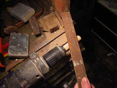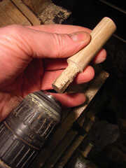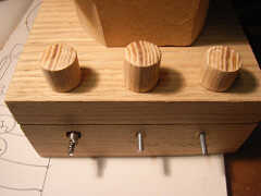 Las perillas de las secciones de la tabla que había sido más o menos redondeado en un extremo con una escofina hasta la cabría en el portabrocas. Esto funcionó bien como la madera de roble se utiliza era bastante difícil no encaje con un eje de unos 1/2".