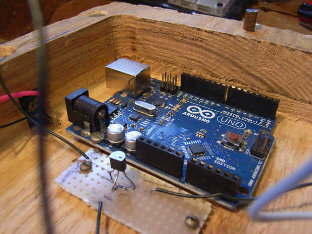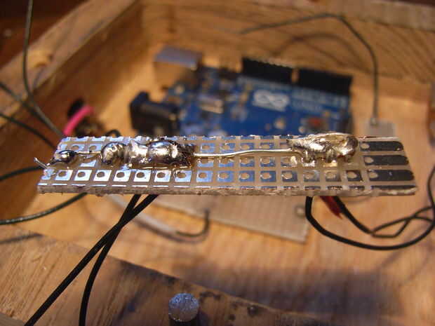 Los potenciómetros fueron en primer lugar (arriba, izquierda), seguidos de la placa Arduino y el circuito de transistor adicional (arriba, derecha)