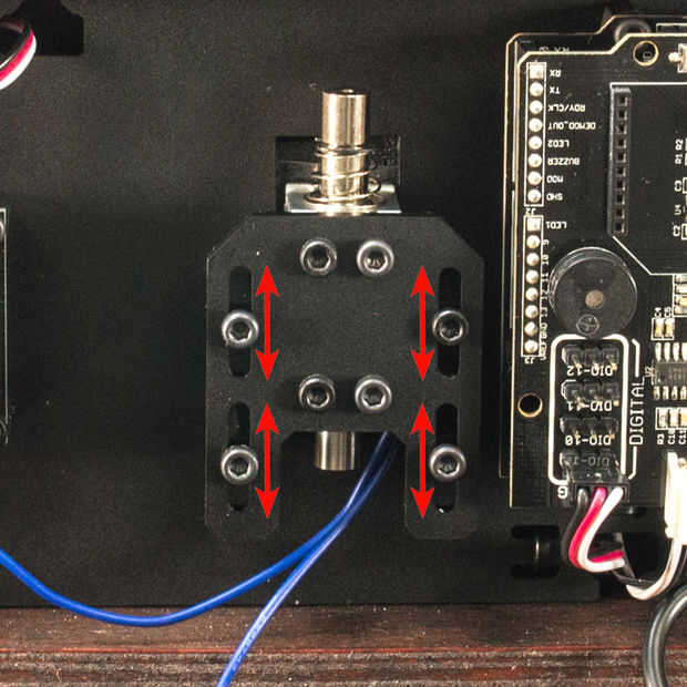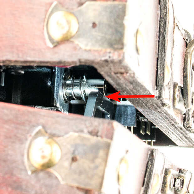 Si usted está construyendo su propio, revisa las imágenes de las piezas del mecanismo de enganche y tener una idea de cómo le gustaría a hacer el tuyo. Cada pieza en el mecanismo de bloqueo puede reubicarse en altura o profundidad. Esto es así el solenoide puede colocarse de manera clara el pestillo cuando se activa, pero cogerlo cuando está apagada. En la última foto, estamos mostrando la posición del solenoide cuando esté inactivo, descansando sobre el borde del pestillo. En esta posición, el émbolo del solenoide debe borrar el pestillo cuando se activa. Puede ser necesario ajustar la posición vertical del pestillo. Si el cierre es demasiado bajo, el solenoide no atraparlo. Si el seguro es demasiado alto, no podría cerrar la caja, o ineficaz se cerrará, dejando un espacio le permite ver el mecanismo aun cuando el émbolo del solenoide se basa en el cierre.