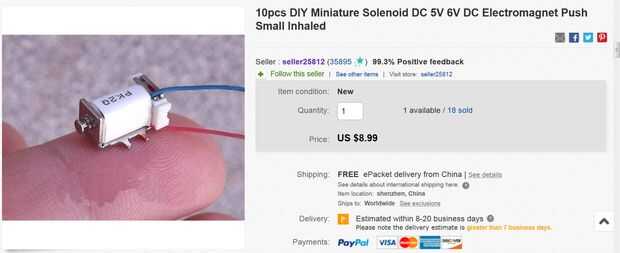 Se consideró que huelguistas de solenoide por fueron el método preferido de excitar las campanadas. Solenoides con resorte devuelve fueron contemplados, pero eran demasiado grandes y también muy costoso. Me topé con algunos solenoides muy pequeños y baratos de un proveedor chino en Ebay y también en Ali-Express (un proveedor chino). También están disponibles en Amazon a un precio de 5 $ 8.00. Estos son imanes muy pequeños , 5 mm en bobinas de diámetro y 7 mm de largo. Contiene un émbolo de 2mm y en un montaje de imán que se moviera... pero realmente no lo suficiente para ser práctico. Ver el video de YouTube de mi primera prueba.