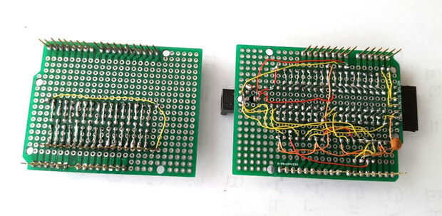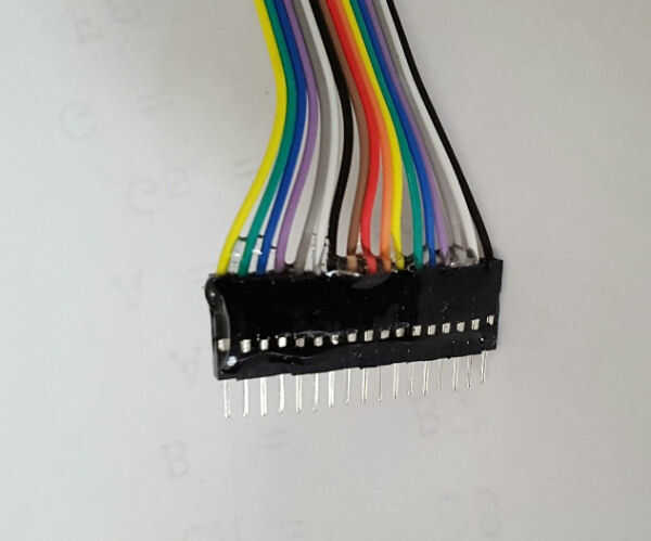 Se hizo un cable de conexión de un cable de largo espectro de 20 cm (17 pines macho en cada extremo). Las cubiertas de pin se consolidado junto con epoxi para conectores en ambos extremos del cable.