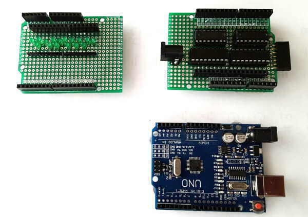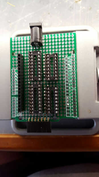 Decidí construir el circuito en una placa de prototipo de escudo de Arduino. Encontré una tabla que era todo plateado a través de orificios e instalado las clavijas pin 16 y 18 para el ICs. También he añadido una tira de 17 pin header hembra para el cable de entrada de montaje de la campana. Una toma de corriente del tablero de PC añadió que podría utilizar una fuente de paquete o energía de batería externa. Esto condujo los drivers Darlington y también fue conectado al pin de Vin de la Arduino. También he añadido otro encabezado que aceptaría un módulo de reloj de tiempo real para uso futuro.