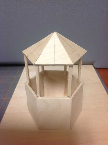 La parte inferior de la cúpula está hecha de seis rectángulos con una base de 4cm y una altura de 5cm. Otra vez, me ingleteando los lados y utiliza pegamento caliente para juntarlos. La cúpula tiene seis puestos de 3mm de ancho y 5cm de largo. Son caliente pegado en las seis esquinas del hexágono con 4cm que se extiende por encima de la parte inferior para sostener el techo. La aguja en la parte superior está hecha de una falsa perla con una palillo de dientes pegado a través lo. Vea la figura 2-4.