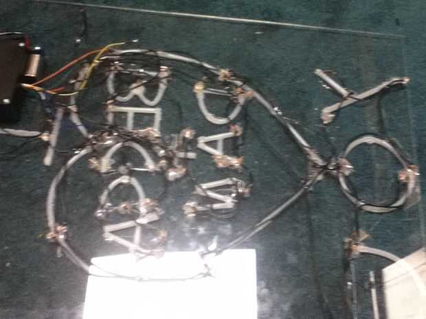 Ahora es el más tedioso, lento, frustrante y gratificante de parte del proyecto: cableado de todos los LED. Que hiciste tu vida más fácil mediante la organización de los cables muy juntas, pero si no no es el fin del mundo, sólo será más difícil. Antes de decidir cómo cablear, deberás decidir qué animaciones que quieras hacer. ¿Quieres cada letra individual a parpadear? ¿o las palabras a parpadear como un todo? Todo esto dependerá de cómo lujo desea obtener con la electrónica y el código. También, al hacerlo, asegúrese de mantener mente salida cuantos pins tienes disponible para utilizan. Usted no quiere tener mas salidas que los pernos! Para mi proyecto, decidí que sería cable cada palabra individual junto, para que el "yo" era un perno, el gran corazón fue un pin, el "dan" fue un broche y así sucesivamente. Con el fin de mantener todo limpio y ordenado, yo sugeriría agujeros muy pequeños en el tablero y pasando los cables en la parte posterior con el fin de mantener aseado el frente mirando. Para empezar, encuentra el positivo de cada LED solo que quiere estar conectado a un pin de salida y conéctelos todos juntos. Hacer esto para cada LED para cada pin. Esto podría ser un poco confuso, así que asegúrese de mirar las fotos. Una vez que todos los aspectos positivos están conectados juntos, volver a través y alambre todos los cables negativos juntos, independientemente de la espiga. Este un gigantesco cable se conectará a la "Tierra", o conector de tierra en la placa Arduino. Ahora lo que tienes es un cables positivos de gigantes (8-10) y un cable negativo.