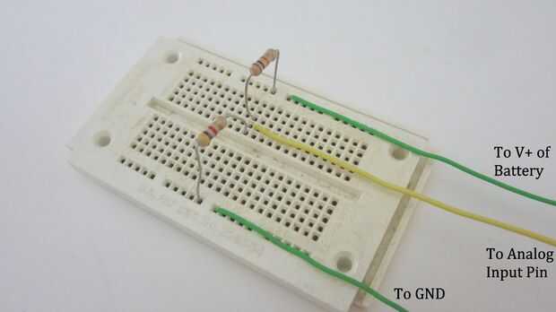 Fácilmente puede utilizar la función AnalogRead para medir una tensión. Por desgracia, sólo puede medir tensiones de hasta 5V. Así que hay hacer un divisor de tensión para reducir el voltaje a algo que se puede medir. Para hacer uno, necesitas dos resistencias. Uno de ellos debe ser dos veces el valor de la otra. Conecte un cable de la resistencia más grande a la línea de + 12V de la batería. Conecte el otro cable de la resistencia más grande a uno de los pines analógicos en modo de entrada. También Conecte uno de los cables de la resistencia más pequeña a este mismo pin analógico. Luego conecte el otro cable de la resistencia más pequeña que el terminal negativo de la batería o el pin GND de Arduino. Luego puede utilizar la función AnalogRead para medir una tensión como un entero entre 0 y 1023. Para convertir esto en voltios puede utilizar la fórmula: V = AnalogRead * 0.0049 * R/r demayor tamañomás pequeño. Aquí es un ejemplo de cómo podría utilizar esta configuración para controlar el voltaje de la batería y desconecte la fuente cuando la batería está baja. Las resistencias solicitadas son 10K y 4.7K.