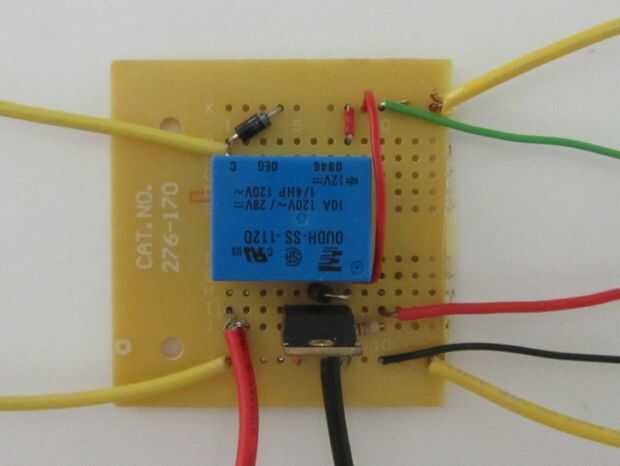 Por último, necesitará añadir un diodo en paralelo con la bobina del relé con el fin de proteger el transistor de puntas de tensión que pueden ocurrir cuando el relé se desactiva.
