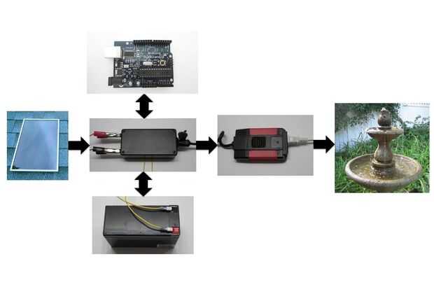 Electricidad que es producida por el panel solar se almacena en la batería. La batería utiliza esta electricidad almacenada para el resto de componentes de la energía. Cuando Arduino envía una señal de alta a la puerta de los transistores, el relé se activa. Esto conecta la energía del inversor y lo convierte. El inversor toma los 12V de la batería y convierte en 120VAC que alimenta la fuente.
