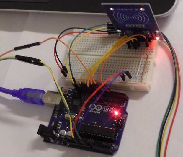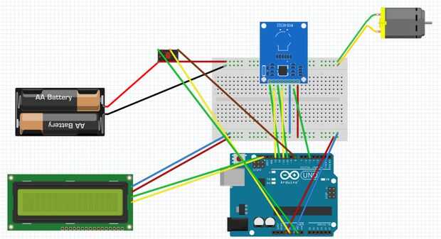 Todos los componentes eléctricos (relés, batería, motor de la C.C., pantalla LCD y módulo RFID) fueron capaces de caber en un mini protoboard alimentado por el Arduino. El diagrama de Fritzing muestra cómo cada componente debe ser cableado.