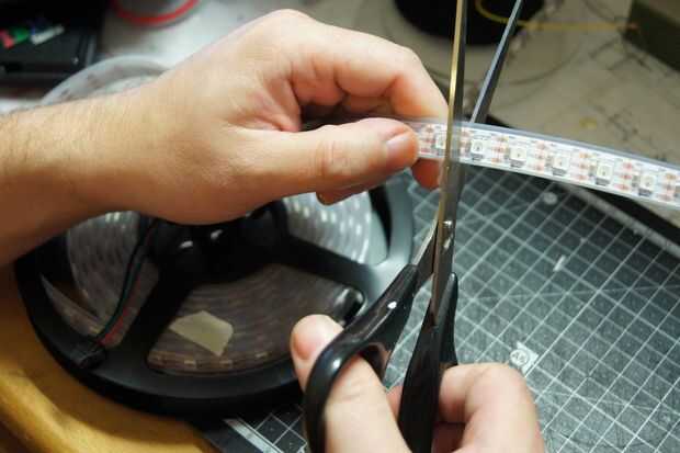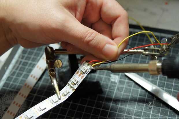 Luego soldar 3 cables a los contactos en el extremo de la tira de LED, una toma de tierra, a VCC y a VI.