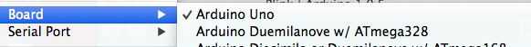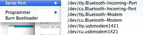 - Asegúrese de que Tools -> Serial Port está establecido en /dev/tty.usbmodem o /dev/cu.usbmodem como estamos conectados con nuestro cable USB, no con bluetooth
