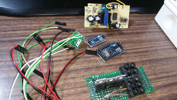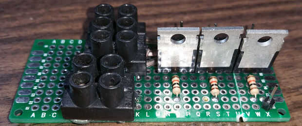 Para tener buenas conexiones, soldado todo juntos. Los MOSFETs se sueldan al tablero con un desplegable y algunos pernos de Dupont. Los conectores de cable negro son caliente-pegado directamente a la Junta.