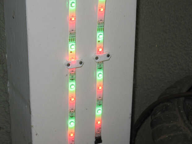 - Tiras de LED impermeables. Asegúrese de prestar atención a los tipos de LEDs utilizados. Ordené con 3528 LEDs en Amazon y los son los que en la foto. Estos son de menor costo, pero tienen una desventaja muy importante! Tienen LEDs rojos, verdes y azules separados aproximadamente 1/2" de distancia, así que no te realmente mezclados colores como el amarillo o naranja con visión directa (a menos que tal vez usted está realmente muy lejos!). Por lo tanto, no serían buenas para la iluminación permanente. Pero, puesto que estoy usando para la Navidad, funcionan OK - cada uno de los distintos colores es un color válido vacaciones, y al girar en rojo y verde al mismo tiempo, alternan muy bien. Los 5050 LEDs son tri-color y así pueden tener cualquier salida de color aparente. Otra cosa a destacar es que algunas tiras tienen 150 LEDs / 5m (16 pies), y algunos tienen 300. Trabajan bastante bien, y 300 LEDs tomaran más poder.
