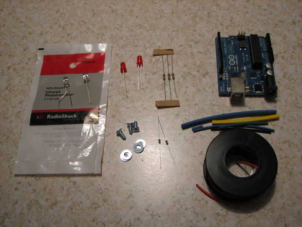 1 - Arduino (cualquier arduino compatible)--Adafruit .com tiene un mini-arduino muy barato (alrededor de $8) llama la "baratija" que debería funcionar muy bien (yo no he probado todavía). Este diseño debe trabajar con 5 voltios o 3 voltios arduinos--de alguna manera, 3 voltios es mejor (menos energía)