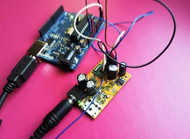 En la biblioteca encontramos ejemplo para chip de FM usado. Las conexiones con el Arduino se describen en el bosquejo.