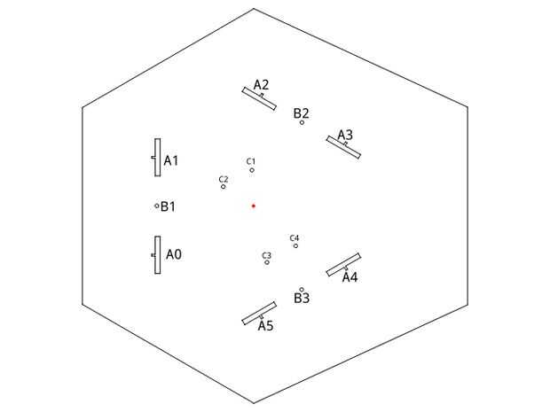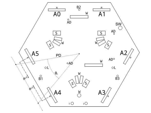 A continuación se que deben cortar piezas principales de base de acrílico basado en base_top y base_bot de plantillas. En primer lugar, fijar la placa en la parte inferior con tornillos a través de los orificios C y fijar las tres patas de conexión (del archivo servo_arm.dxf) los orificios de la B1-B3. Siguiente lugar servos en la parte superior, servos deben estar instalados en los orificios A0-A5, su cable de señal debe ser conducida a través de orificios S y W, manera el derecho puede verse en una imagen proporcionada, conecte todos los conectores de servo a la Junta, también obtener todos los cables de señal ir en el Arduino a la parte superior a través de agujeros w. Fijar ahora el extremo del conector en la parte superior de la base, ahora deberá unir firmemente, si pueden mover servos, fijarlas con un poco de pegamento de pistola de pegamento caliente del derretimiento.