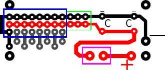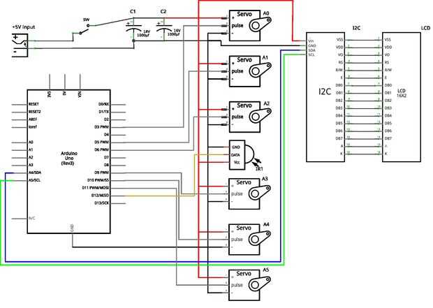 Para construir la base de la plataforma lo haremos en la primera necesidad para construir el PCB para conectar fuente de alimentación externa para los servos. La idea básica detrás de él y todo esquema de todas las conexiones se observan en el esquema. Diseño de la PCB está en el power_board_layout.svg. A toda la conexión de puntos en el rectángulo azul irá pins para la conexión de servos. En zona verde debe tomas para proveer energía a los otros accesorios como LCD y IrDA. En púrpura se muestra el punto de conexión del interruptor. Por la letra C son posiciones denota de condensadores. Cable de señal de última está conectada a tierra, éste se conectará a la toma GND de Arduino. Sin esta conexión, servos funcionaría muy mal.
