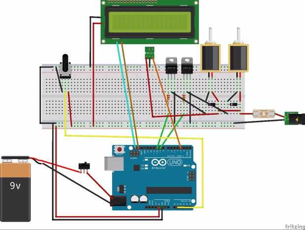 7. los dos solinoids a través de los transistores y diodos a digitales pines 9 y 10. (Éstos Obtén 24V y toman 1,5 amperios).