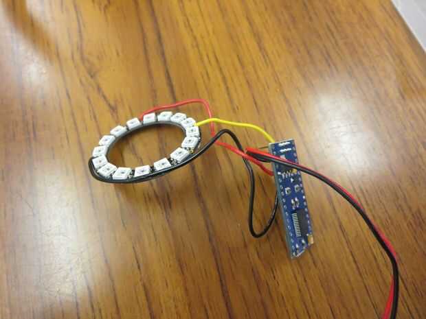 Para la iluminación he comprado unos anillos de NeoPixel, donde cada uno de los LED es individualmente direccionable y color variable. Cavado un Arduino Nano barato que conseguí de ebay para alrededor de £4 y conectados todos juntos.