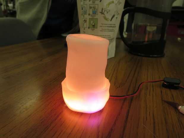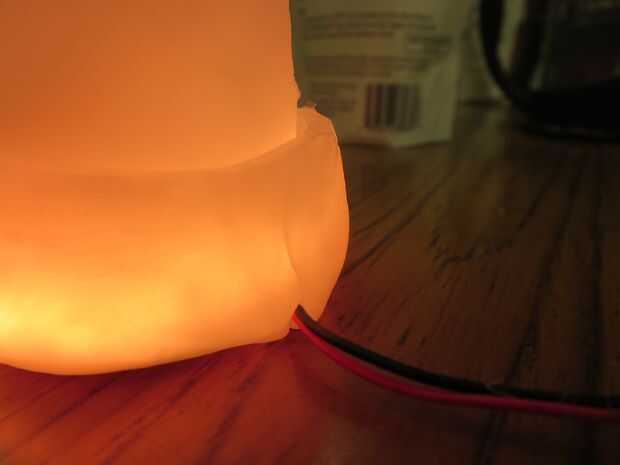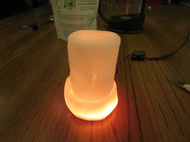 Para detenerme en el LED hizo una cubierta para pasar alrededor de la base. Como InstaMorph es reutilizable, así que simplemente volver a calentar el agua, poner todos los recortes des en pedacitos a la izquierda en el agua e hizo otra hoja plana. Moldeó la sábana alrededor de la base y de LED. El cable fue un poco de un problema, así que sólo cortar una raja, empujada el alambre a través y luego coloqué detrás juntos.