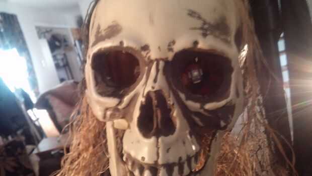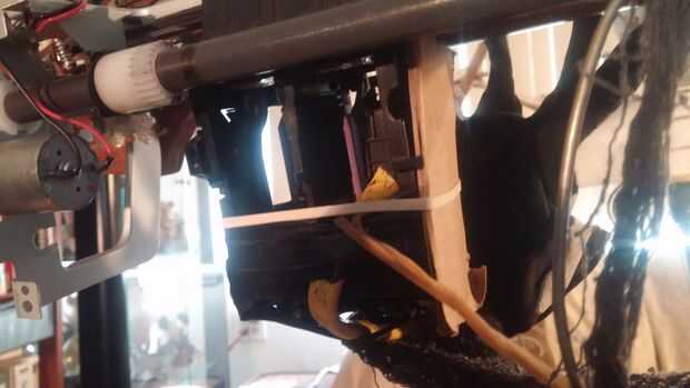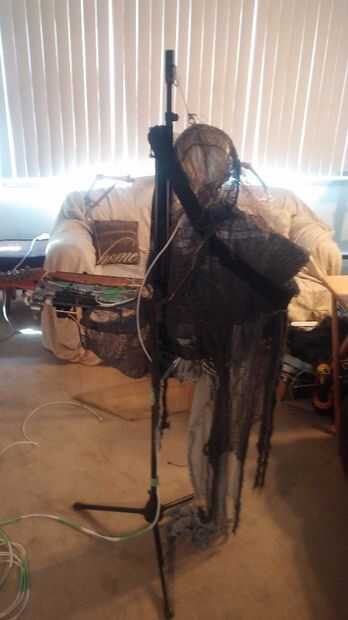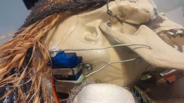 Este proyecto comenzado cuando me topé con un viejo carro de la impresora. Pensé que tenía que haber alguna manera de hacer que funcione para mi idea de la banda de rock de esqueleto para Halloween. Es una antiguo colgante plástico esqueleto prop que es sólo la cabeza y los brazos con tela sobre él. Colgué el esqueleto y la guitarra de un pedestal para micrófonos. El carro de la impresora está conectado al cuello de la guitarra con ataduras de cremallera. El motor está conectado a 2 relés que inversión la polaridad al motor cada vez que se activa el relé. Esto envía el carro arriba y abajo del cuello. Con un trozo de alambre rígido, una banda de caucho y un guante de esqueleto, se convierte en los esqueletos desgaste mano. El video muestra mi primera versión de este programa de instalación utilizando micro-switches, un temporizador 555 y un relé forma C de 12 voltios. Ahora el Arduino reemplaza a todos. Puesto que la mandíbula está articulada, pensé que debería cantar así. Os adjunto un servo a la base del cráneo usando un metal de la vieja lata de café que formé en forma con tijeras y un martillo. El cuerno del servo se conecta a la parte posterior del hueso de la mandíbula con un alambre rígido para que cuando el servo se mueve, abre y cierra la boca. El servo está conectado al terminal 9 de la Mega. El código controla la izquierda voz única salida de los archivos de audio y lo traduce en movimiento de servo. Los ojos iluminan y flash a lo largo de la música con dos LEDs de 12 voltios (T10 LED automotriz). Estos están conectados a través de un transistor NPN para que la salida PWM del Arduino puede controlar el brillo de los LEDs de 12 voltios. (Nota: el diagrama en las fotos se muestra conectado al terminal 13 del ONU. En mi configuración va a terminal 10 del Mega, que es el canal de música.)