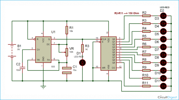 Comencé esto antes de que incluso pensé en usar un Arduino, por lo que es más o menos autónomos. Consiste en diez 12 voltios T10 LED automotriz conectado a un chip de contador de década CD4017 y un temporizador 555. Hay una resistencia variable para controlar la velocidad de los destellos. Arduino controla esto mediante la activación de un relé que envía 12 voltios a esta configuración. El diagrama muestra resistencias para cada uno de los LEDs (R2 - R11), pero desde que estoy utilizando los 12 voltios de T10, estos no son necesarios.